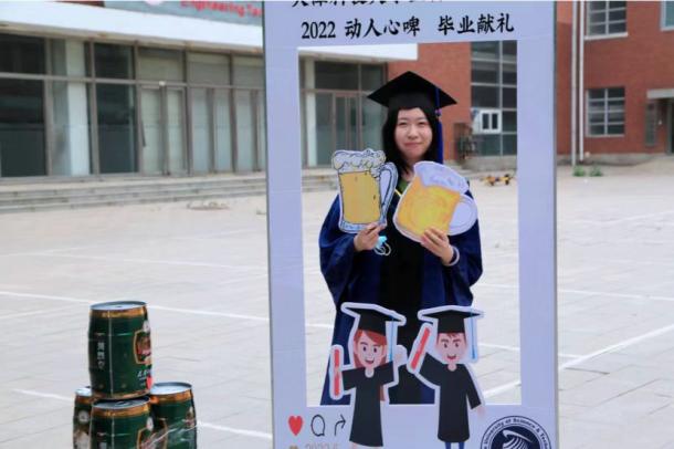毕业学子与学院教师纷纷在学院特制的“动人心啤毕业献礼”主题背景板处合影留念,手持各式啤酒杯的拍照板,留下青春年华中最美好的回忆。