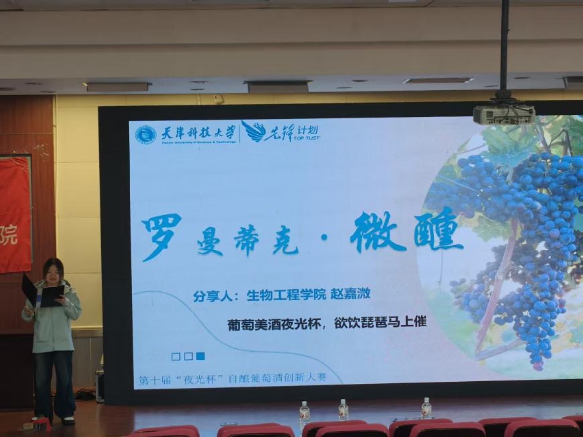 第十届葡萄酒大赛一等奖获得团队代表赵嘉溦同学为大家分享的经验与心得,从赛前的队伍组建,到理念构思,以自己的亲身体验向大家介绍实验操作中的工艺参数调控、风味物质检测要点等关键细节,层层递进地拆解了备赛全流程。同时,她还分享了团队在数据记录规范、成果可视化呈现等方面的实用方法,为在场同学提供了清晰的参赛路径参考。