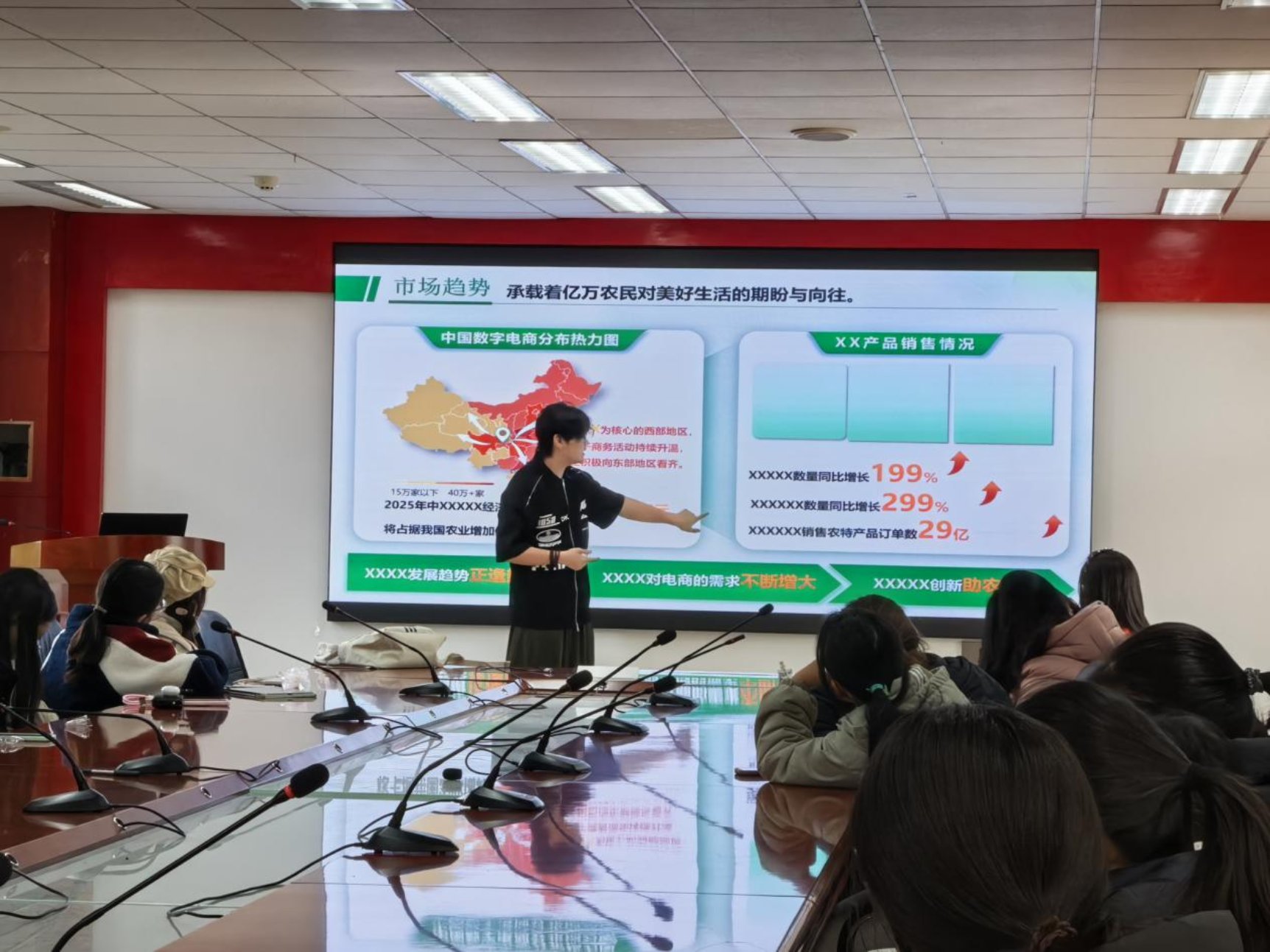 在技法传授环节,焦琪耀如数家珍般展示了提升制作质效的“智慧锦囊”:从“豆包”AI的精炼标题,到“DeepSeek”的内容拓展;从WPS的便捷模板,到拼多多的精品资源;从抖音的潮流美学,到PPT文字排版。他特别强调:“数据要说话,版面要呼吸”,通过可视化设计与留白艺术,让每一页PPT都成为生动夺目的载体。